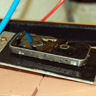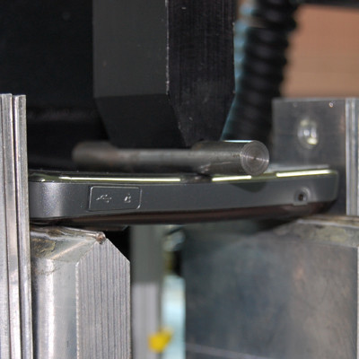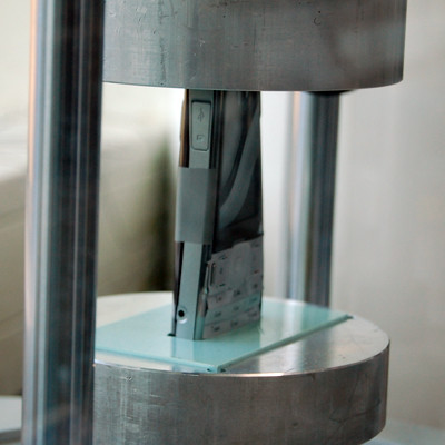 Телефон давят прессом до полного уничтожения. Разумеется, в это время проводятся замеры давления.