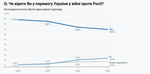 Согласно результатам опроса фонда "Демократические инициативы" и Центра Разумкова, значительный сдвиг в вере в победу Украины произошел в 2024 году, когда доля тех, кто верит в победу Украины, снизилась на 11%. За последний год снижение веры в победу Украины продолжилось, составив 4 процентных пункта, что лишь немного превышает теоретическую погрешность выборки.