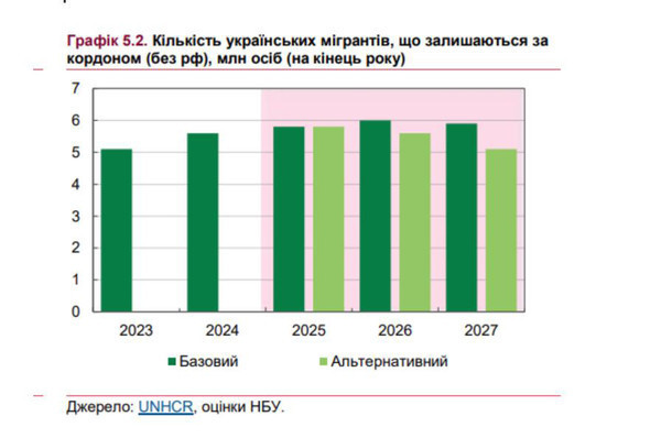 За оцінками НБУ, у 2025 та 2026 роках Україну залишать по 200 тисяч осіб щороку. Натомість квітневий прогноз передбачав початок повернення вже у 2026 році (200 тисяч).