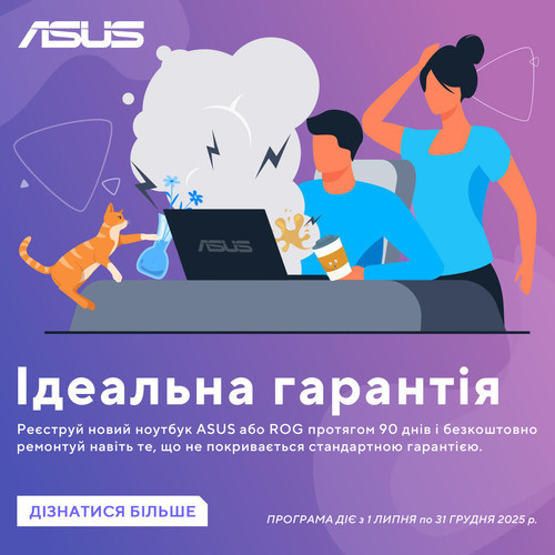 ASUS Perfect Warranty не поширюється на навмисні пошкодження, збитки, спричинені стихійними лихами, протиправними діями, неавторизованим втручанням тощо. Детальні умови програми та перелік підтримуваних моделей доступні на офіційній сторінці: https://www.asus.com/ua-ua/event/perfectwarranty/