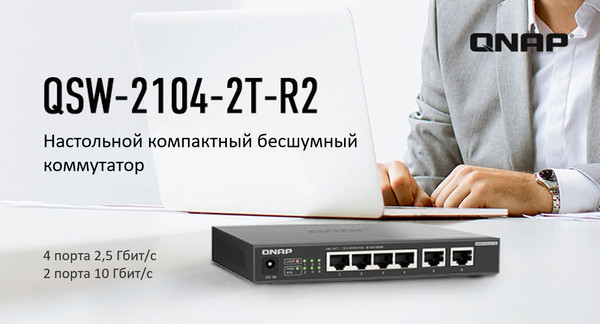 Компания QNAP выпустила неуправляемый коммутатор QSW-2104-2T-R2 с четырьмя портами 2,5 Гбит/c и двумя портами 10 Гбит/c.
