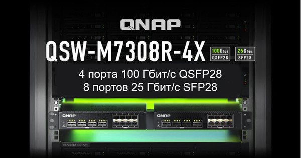 Компания QNAP выпустила управляемый коммутатор QSW-M7308R-4X с четырьмя 100-гигабитными портами QSFP28 и восемью 25-гигабитными портами SFP28, представляющий собой экономичное и компактное решение для малого и среднего бизнеса, которое идеально сочетается с NAS QNAP и другим оборудованием с сетевыми интерфейсами 25 и 100 Гбит/c.