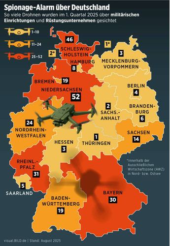 Над американской авиабазой Рамштайн и в Бремерхафене (важный порт) было замечено до 15 беспилотников, одновременно летающих строем.