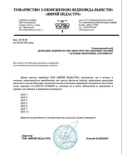 Один з виробників, компанія Vyriy, виграла 16 контрактів на постачання і відмовилась від 15 з них. Таким чином, постачання критично важливих дронів на фронт може затриматися через процедуру перепідписання контрактів з наступними переможцями в черзі.