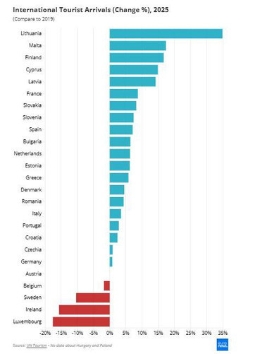 Найстрімкіше зростання кількості мандрівників відзначають Литва (+21%), Мальта (19%), Латвія (16%), Фінляндія (+15%) та Іспанія (+6%).