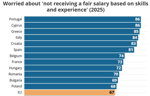 Найвищий рівень занепокоєння чітко спостерігається в Південній Європі. До них належать Португалія (86%), Кіпр (86%), Греція (85%), Італія (84%), Хорватія (83%) та Іспанія (81%).