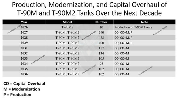 Паралельно, згідно з тими ж документами, до 2036 року передбачено оновлення ще 828 танків Т-72 до рівня Т-72Б3М, із найбільшими обсягами модернізації також у 2028-му. Загальна ціль бронетанкової програми РФ на 2026–2036 роки становить приблизно 2 600 машин, без урахування вже виготовлених у 2024–2025 роках.