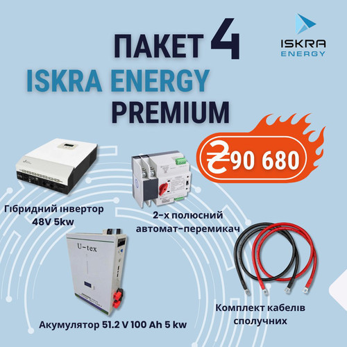 - Premium Iskra Energy - максимальний рівень автономності та надійності. Сюди входять гібридний інвертор UTEX-GA5048MH, 5000 кВт та акумулятор на 5 кВт.