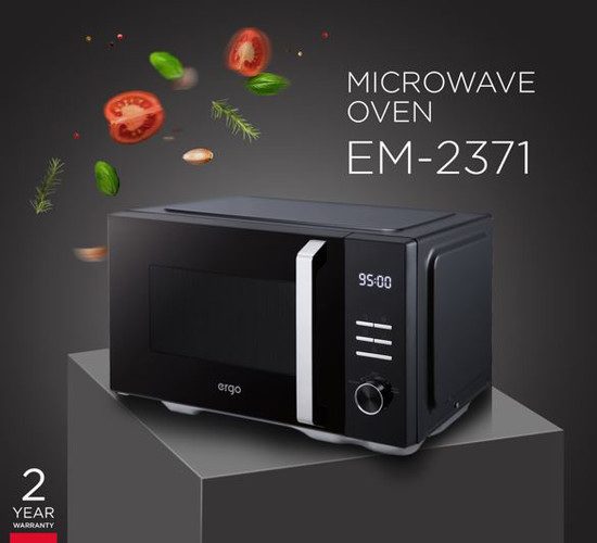 Модель ERGO EM-2371 виконана в практичному чорному кольорі та вирізняється стильним сучасним дизайном, а також наявністю вбудованого годинника і комбінованого управління, в якому поєднуються кнопки й механічне коліщатко. Крім того, в цій моделі весь внутрішній об’єм мікрохвильової печі доступний для розміщення продуктів, а відсутність поворотного столу не лише економить простір, але й полегшує догляд за пристроєм. Серед інших характеристик і переваг новинки – 23 літри об’єму, 800 Вт потужності з можливістю регулювання в 5 ступенях, наявність 8 автоматичних програм для швидкого запуску потрібного циклу розігрівання чи розморожування, цифровий годинник і таймер на 30 хвилин. Замок від дітей захищає як саму малечу, так і пристрій від можливих неприємностей.