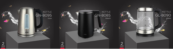 Модель ERGO GL 8090 має об'єм 1,7 л, потужність 1850-2200 Вт, корпус зі скла й нержавіючої сталі, а також LED-підсвічування під час роботи. Електрочайник ERGO GN 8085 більш компактний: співвідношення об'єму 1 л і потужності 1000-1200 Вт дозволяє швидко та економно нагрівати воду. Крім того, корпус цієї моделі має подвійні стінки з нержавіючої сталі, забезпечуючи ефект термоса. Наявність світлового індикатора роботи допомагає бачити, чи увімкнений чайник в певний момент. Об'єм електрочайника ERGO GN 8095 становить 1,7 л, а потужність – 1850-2200 Вт. Ця новинка має корпус з нержавіючої сталі з пластиковим напівпрозорим віконцем, а також оснащується світловим індикатором роботи.