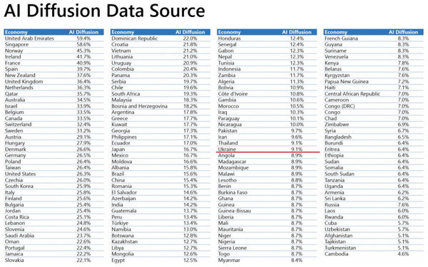 Самые высокие темпы внедрения ИИ наблюдаются в ОАЭ (59,4%), Сингапуре (58,6%), Норвегии (45,3%) и Ирландии (41,7%). Украина с 9,1% делит 92-93 места с Таиландом.