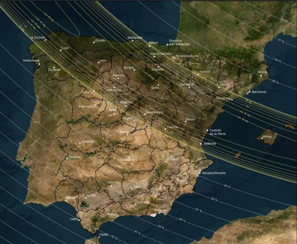 В зоне полного затмения окажутся Ла-Корунья, Овьедо, Бильбао, Леон, Бургос, Сарагоса, Валенсия, Пальма-де-Майорка.