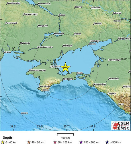 На сайте Европейского средиземноморского сейсмологического центра говорится, что землетрясение магнитудой 4,8 произошло вблизи оккупированного Крыма — в 78 км к северо-западу от Керчи и в 35 км от Щелкино, на глубине 10 км.