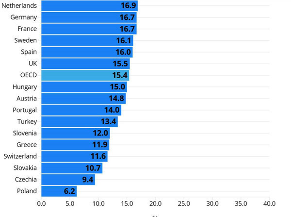 Серед 27 країн Європейського Союзу частка податку на прибуток від валової зарплати для самотньої людини без дітей варіюється від 6,2% у Польщі до 35,7% у Данії.