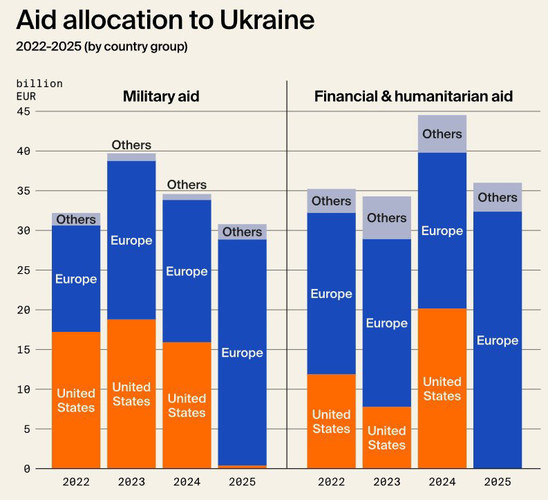 Однако из-за того, что США фактически прекратили бесплатную помощь, общий объем военной поддержки Украины в 2025 году был меньше на 13%, гуманитарной и финансовой — на 5%.