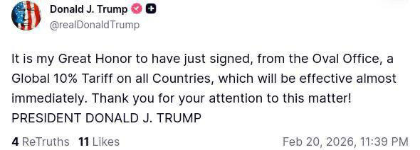 "Для меня большая честь подписать из Овального кабинета глобальный 10-процентный тариф в отношении всех стран, который вступит в силу почти немедленно", — написал в соцсети президент США.