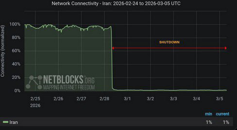 Уровень доступности интернета в Иране упал до 1% от обычных показателей на фоне продолжающихся масштабных сбоев.