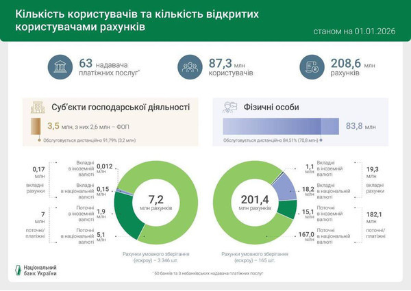 На початку 2026 року загальна кількість рахунків у надавачів платіжних послуг досягла 208,6 млн — це на 8,2% більше, ніж торік (192,8 млн).
