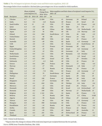 У 2021–2025 роках частка України у світовому імпорті основних видів озброєнь склала 9,7%.