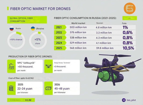Але коли кабель дорожчає, “анти-РЕБ” раптом стає економічною категорією. Тут показовий паралельний сигнал із ринку: китайські постачальники підняли ціни для російських клієнтів у 2,5–4 рази на старті 2026-го; при цьому наводяться цифри: G.652D у Китаї нібито зростав із $2.33/км (початок 2025) до $5.80/км (січень 2026), а РФ у 2025-му начебто “з’їла” ~10,5% світового обсягу оптоволокна — близько 60 млн км, тоді як раніше її частка була <1%.