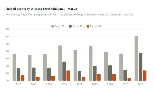 Американське метеорне товариство (AMS) повідомило про різке збільшення кількості потужних болідів - яскравих вогняних куль у атмосфері - протягом першого кварталу 2026 року.