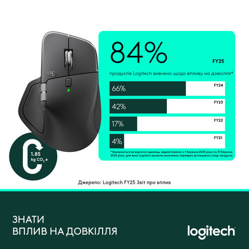 ● Друге життя пластику. Сьогодні 78% продуктів Logitech (майже 4 з 5 пристроїв) містять перероблений пластик. Це означає, що мишка на вашому столі може бути зроблена з вашої старої пластикової пляшки. У 2024 році це дозволило уникнути понад 35 000 тонн CO₂-еквіваленту.