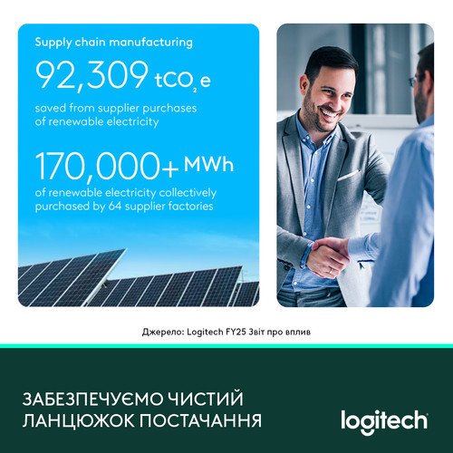 ● 93% електроенергії в офісах і на виробництві Logitech надходить із відновлюваних джерел. Компанія підтримала 64 постачальники у переході на «зелену» енергію, що додатково скоротило понад 90 000 тонн CO₂.