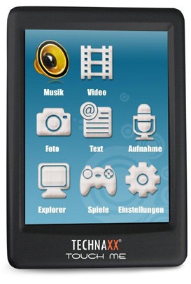 Вот и компания Technaxx решила завоевать популярность, использовав в своей модели TouchMe "принцип iPod Touch" - устройство обладает широким 2.8-дюймовым, конечно же, сенсорным дисплеем с разрешением 320 x 240, слотом для карт памяти microSD и интерфейсом USB 2.0. Плеер также поддерживает форматы MPEG4, AVI, MP3, WMA, JPG, BMP и возможность чтения электронных книг.