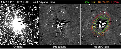 На изображениях, переданных на Землю автоматической межпланетной станцией New Horizons, впервые запечатлены Кербер и Стикс — два самых маленьких из пяти известных спутников Плутона.