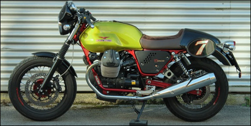 Новинка отличается зеленой покраской и красной рамой, которая являются дань редкому мотоциклу Moto Guzzi V7 Sport Telaio Rosso 1971.