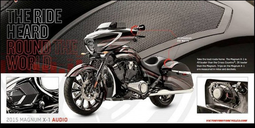 Victory Magnum X-1 будет отличаться кастомной покраской и громкой аудисистемой с большим количеством динамиков -в 4 раза мощнее системы Cross Country и в 2 раза мощнее системы на базовой моделе Magnum