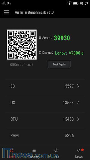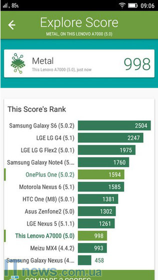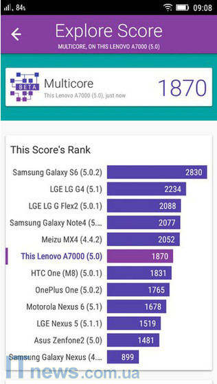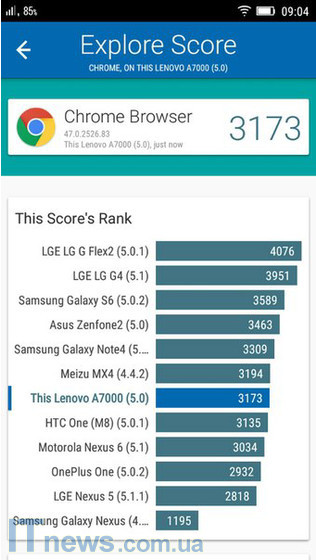 Lenovo A7000 получил 5,5-дюймовый IPS-дисплей с разрешением 720х1280 точек. Плотность пикселей на дюйм довольно неплохая – 267ppi; зерна почти не видно.
