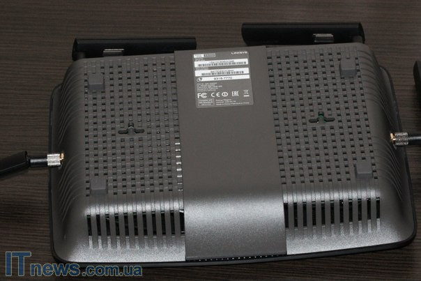 Противоположная сторона корпуса, кроме немалого количества вентиляционных сеток, обладает также крупными резиновыми насадками по периметру панели, петлями для крепления маршрутизатора на стенку или другую вертикальную плоскость плюс небольшой информационной наклейкой с некоторыми данными об устройстве, включая его маркировку.
