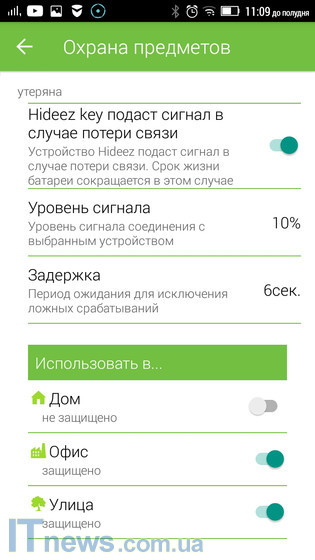 Что касается охраны предметов, для этого предлагается задать пункт "Отслеживать потерю связи". Также можно задать установку, чтобы ключ издавал звуковой сигнал в случае потери связи. Кроме того, для этого действия можно выбрать различные сценарии: дома, в офисе и на улице. Места нахождения можно редактировать, задавая им разнообразные критерии.