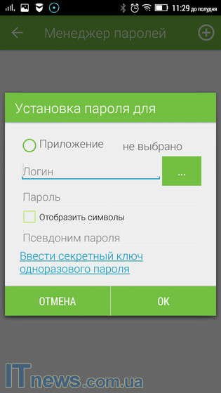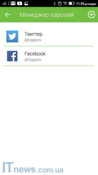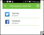 Заходим, например, в менеджер паролей. И, пользуясь тем самым плюсиком в правом верхнем углу, добавляем пароли доступа к различным приложениям. Для этого нажимаем на кружок Приложение, после чего выводится список всех программ, установленных в смартфоне. Выбираем соответствующее, вводим к нему логин и пароль.