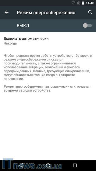 Не обошлось "на борту" 50 Power и без функции "Энергосбережение". Все что нужно, чтобы она заработала – переключить соответствующий ползунок в подменю; все остальные настройки реализованы автоматически.