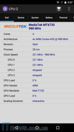 "Сердцем" системы является 4-ядерный MediaTek MT6735P, тактовая частота которого 1 ГГц. "В связке" здесь графика Mali-T720 и 2 ГБ оперативной памяти.