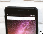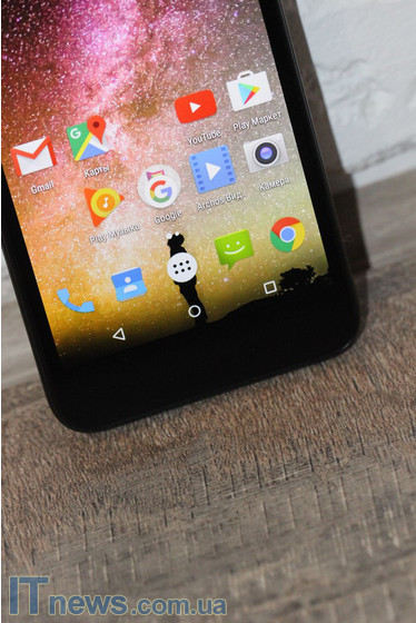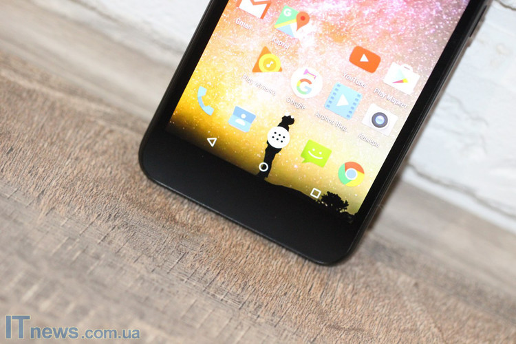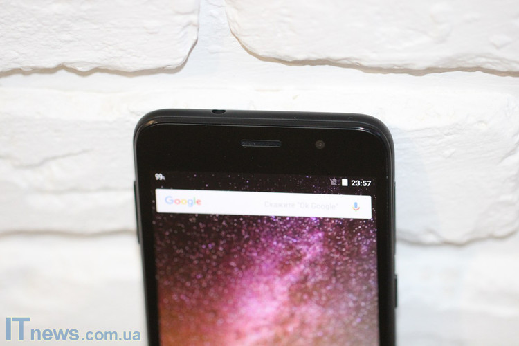 Передняя панель смартфона "разделена" между дисплеем, тремя сенсорными кнопками, вынесенными на экранную часть, а еще прорезью разговорного динамика, глазком фронтальной 2Мп камеры и датчиками освещенности и приближения.