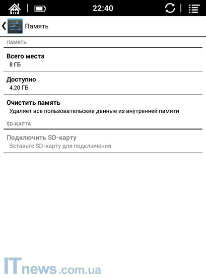 На практике этой "связки" вполне достаточно для комфортной работы со всеми функциональными особенностями ридера: чтение, просмотр фото, проверка электронной почты и пр. Незначительные "раздумия" заметны во время WEB-серфинга, но особого дискомфорта они не доставляют. Да и потом, здесь нужно учитывать, что в Сети мы все-таки "сидим" с ридера, а не, к примеру, планшета. Словом, по итогам я не склонен заносить отмеченный выше нюанс в минусы.