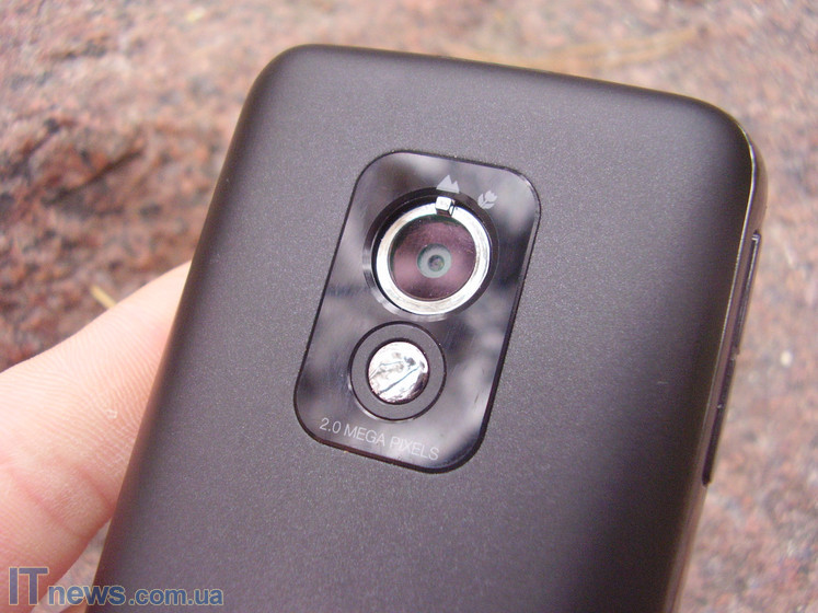 На тыльной панели находится глазок встроенной камеры с сенсором 2 мегапикселя и глазком вспышки. Здесь же устроена крышка аккумуляторного блока, которая прячет под собой батарею емкостью 1100 мАч, а также слот для карт расширения памяти.