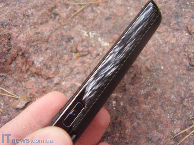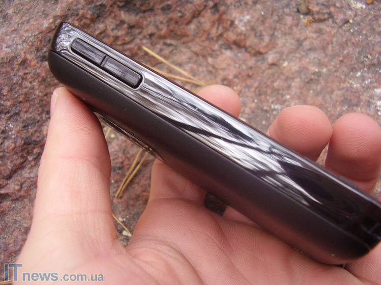 Кнопочно-разъемный механизм боковых граней устройства представлен несколькими элементами, расположенными практически равномерно по всему периметру. На правой боковой грани находится кнопка быстрой активации встроенной камеры. На левой – клавиша-качелька регулировки громкости звука. На верхнем торце находится кнопка включения/выключения питания устройства, а также динамик громкой связи. Прямо напротив верхнего торца, на нижней грани устроен универсальный mini-USB разъем для подключения кабеля зарядки/синхронизации с компьютером, а также подключения проводной гарнитуры. Рядом с этим разъемом устроена прорезь микрофона.