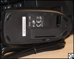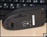 По периметру снизу несколько тефлоновых насадок, обеспечивающих скольжение мышки фактически по любой поверхности. Здесь же аккумуляторный отсек, пенал для микроприемника, порт сенсора и две наклейки с разнообразной информацией об устройстве.