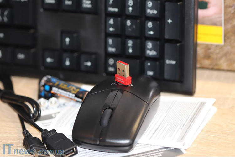 Открыв коробку, внутри я первым делом заприметил удлинитель для микроприемника. Да, производитель предусмотрел тот вариант, когда у пользователя системный блок может находиться под столом или в другом укромном месте вне прямой видимости мышки и клавиатуры, а потому качество сигнала может быть нестабильным. Еще здесь одна батарейка АА – для мышки, и две ААА – для клавиатуры. Ну и, конечно же, есть гарантийная документация.