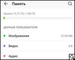 Встроенной пользовательской памяти "на борту" немало – 128 ГБ. Однако, как и в любом другом устройстве, работающем под управлением Android, в нашем подопечном определенная часть дискового пространства уже изначально занята ОС и различными техническими файлами - практически 12,5 ГБ. Все остальное из этих 128 ГБ можно использовать.