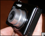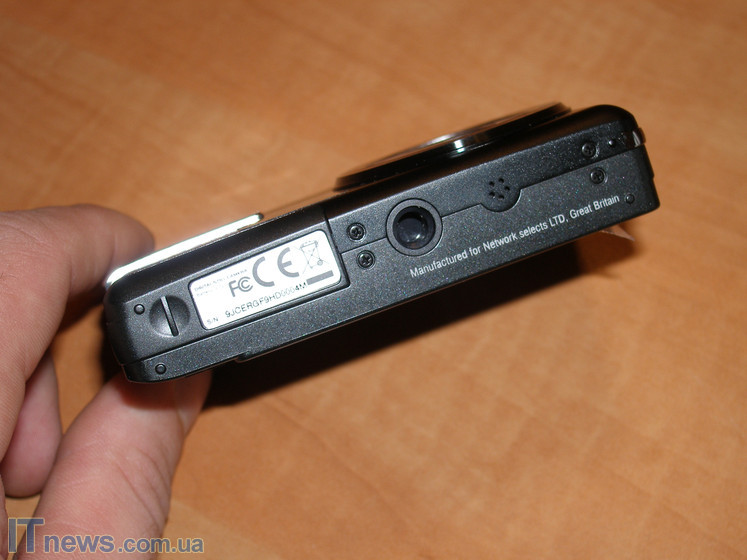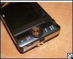 На передней панели находится средней величины объектив. Пребывая в состоянии ожидания, он легко "прячется" в корпус камеры, а сам глазок заслоняется шторкой. Стоит также сказать, что объектив устроен на небольшой приподнятой над основанием корпуса конусе, что в некотором роде должно способствовать защите самого объектива от физического воздействия внешних источников. Впрочем, на практике частично наши слова подтвердились. Отчасти же, надо полагать, это реализовано в декоративных целях.