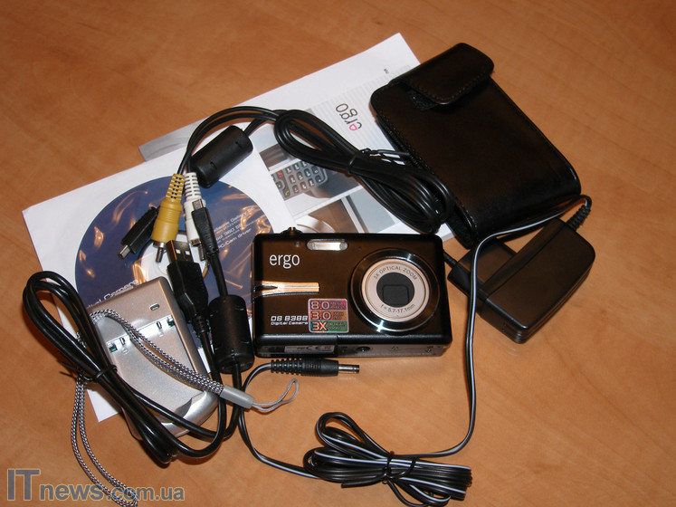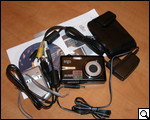 В довольно компактной упаковке, помимо непосредственно самой камеры, мы обнаружили шнур синхронизации с компьютером, а также видео кабель, страховочный шнурок, чехол для ношения устройства, зарядное устройство, аккумулятор, а также диск с ПО, гарантийный талон и руководство пользователя.