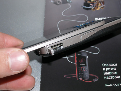 На левой боковой грани находится слот для карт расширения встроенной памяти. К слову говоря, встроенной памяти в Nokia N85 всего 74 МБ, но при всем при этом можно расширить флеш-карточкой до 8 ГБ.