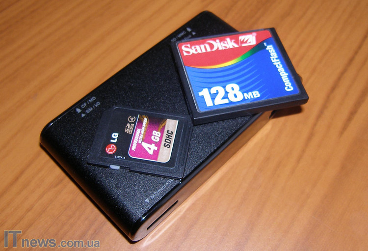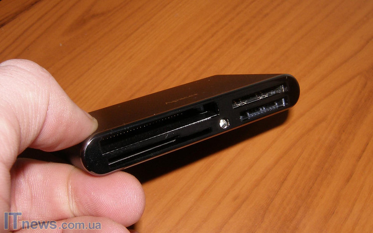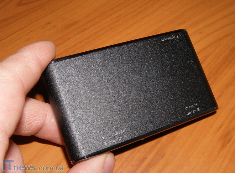 На противоположной панели от той, на которой нанесена эмблема компании-производителя, находятся подписи слотов картридера. С какими же типами карт памяти может работать этот гаджет? Список следующий: Compact Flash, SD, SDHC, Mini SD, Mini SDHC, MMC, MMCmobile, MMCplus, RS-MMC, Smart Media, Memory Stick, Memory Stick Pro, Memory Stick Duo, Memory Stick Pro Duo, Memory Stick Magic Gate, Memory Stick Pro MagicGate, Memory Stick Duo MagicGate, Memory Stick Pro Duo MagicGate, Memory Stick ROM, Micro SD, Micro SDHC и M2. Вот такой арсенал.