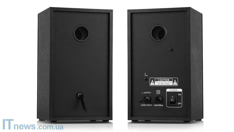 Задні стінки примітні виводами відповідних кабелів, а крім того, на стінці активної колонки – перемикач живлення плюс наліпки з різноманітними технічними даними, на які особисто я раджу звернути увагу!