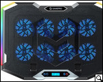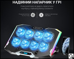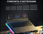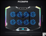Отже, вище ми вже розібрались – верхня панель у нас металева. Ближче до користувача не буде складністю помітити відкидні ніжки-підставки під ноутбук – зроблено для того, щоб машинка" не "їхала" по поверхні під час розміщення СР870 під кутом. Трохи нижче помітите невеличкий дисплей з чотирма кнопками – дві справа та стільки ж зліва. В принципі, розібратися з призначенням їх не буде складністю, навіть без попереднього підключення підставки до порту ноутбука. Однак з відповідним підключенням дізнаєтесь, що регулювати швидкість вентиляторів можна по шести передбаченим тут режимам, а підсвітка підставки буде працювати, навіть якщо ви вимкнете роботу вентиляторів. Крім того, дисплей тут також з підсвіткою, вона спрацьовує, якщо ви працюєте з кнопками – регулювання швидкості обертів, вимкнення вентиляторів або ж обрання одного з 10 режимів роботи підсвітки.